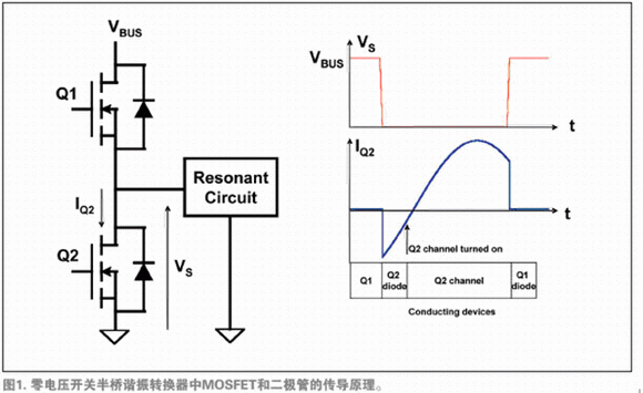 圖1所示為零電壓開關半橋諧振轉換器中MOSFET和體二極管的傳導原理。在這種轉換器中,電流波形滯后于電壓。假設Q1開通,Q2關斷。Q1傳導諧振電流。在一定時間之后,由控制環路決定,Q1關斷。這時,諧振電流流經Q2的體二極管。在負電流期間的某一時刻,Q2導通,減小傳導損耗。當其上電壓為體二極管的正向電壓時(遠小于總線電壓),Q2導通。這就是有效的零電壓開關。Q2中的諧振電流反向。在一定時間之后,同樣由控制環路決定,Q2關斷。當大電流流過,且Q2的電壓擺幅接近總線電壓時,這種關斷順序并非低損耗。