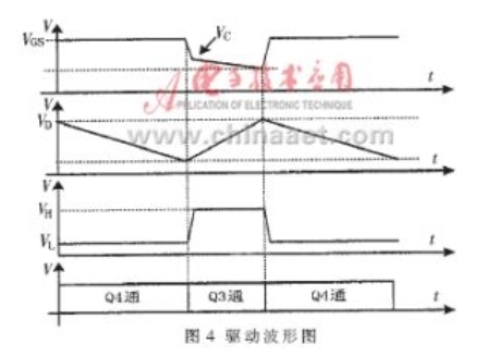 由于加速電容C4的作用,實際工作時,MOSFET的柵-源極輸入脈沖的下降沿非常陡,且又由于柵-源極輸入電容的作用,使VGS 波形具有一定的斜率,這有利于MOSFET的飽和導通。圖4為驅動波形。