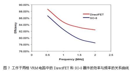 圖7示出了工作于兩相VRM電路中的DirectFET和SO-8器件的效率與頻率的關系曲線。兩者的效率測量都是在20A/相位的負載電流條件下進行。在整個頻譜范圍內(nèi),采用DirectFET的VRM電路表現(xiàn)出高于采用SO-8的VRM電路的效率水平。兩種電路的效率差異還會隨著頻率的升高而增大。該結果反映出DirectFET器件的封裝寄生損耗較SO-8器件低。DirectFET封裝器件還能夠在更高的負載電流條件下工作。例如,在1MHz條件下,DirectFET VRM電路能夠?qū)Ω哌_30A/相位的負載電流進行開關操作,并同時將電路板的溫度維持在100℃以下。而在相同的工作條件下,SO-8器件則只能對20A/相位左右的負載電流進行開關操作。DirectFET VRM電路較高的電流處理能力可歸功于結合了更低的封裝寄生效應以及更高的熱