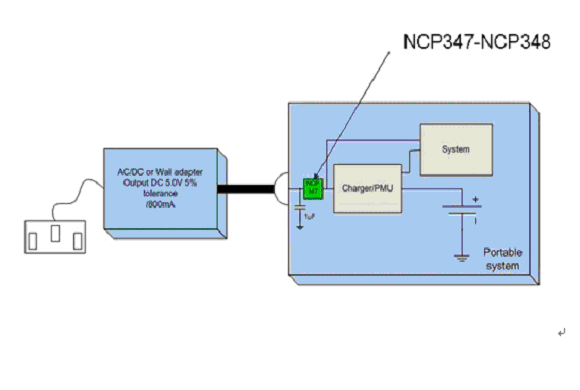 OVLO所定的電平必須高于AC-DC的最大輸出工作電壓并低于系統首個元件的最大額定電壓。圖1所示為一個基于全集成OVP器件的典型便攜式設備的結構(此處的OVP采用的是NCP347MTAE)。