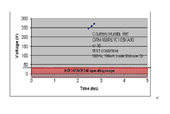首先要檢查的是該電容的直流偏置曲線,以保證其工作時所能承受的電壓高于UVLO到 OVLO這個電壓范圍。例如,假設保護器件前方需要一個1µF的陶瓷電容。