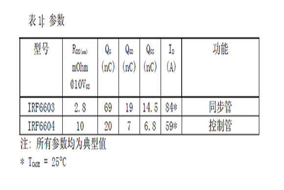 此設(shè)計(jì)可以高效輸出超過100A(>25A/相)的電流而面積只有95mm×31mm(3.8inch X 1.25inch )。每項(xiàng)均使用一個(gè)控制管和一個(gè)同步管的DirectFET MOSFET。用作控制管和同步管的30V DirectFET的規(guī)格見表1。請(qǐng)注意它們高的載流能力省去了器件并聯(lián)的需要。