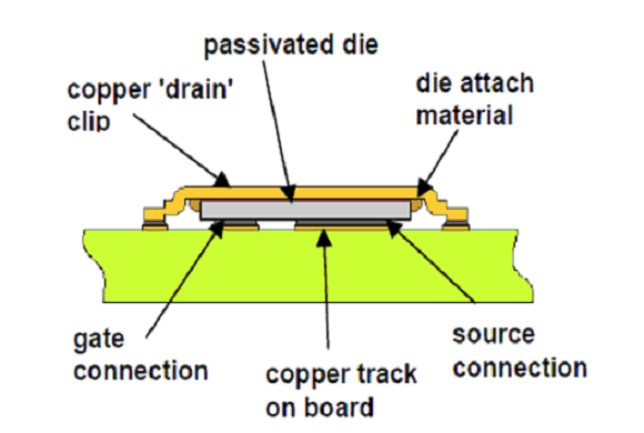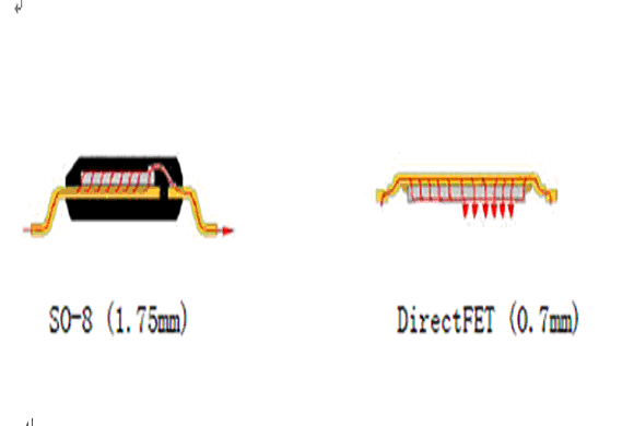 傳統(tǒng)的MOSFET使用引線鍵合來實(shí)現(xiàn)硅片和管腳框架之間的電連接,而DirectFET,將接觸面的數(shù)目和傳導(dǎo)路徑的長(zhǎng)度減到最小從而減小了傳導(dǎo)損耗。