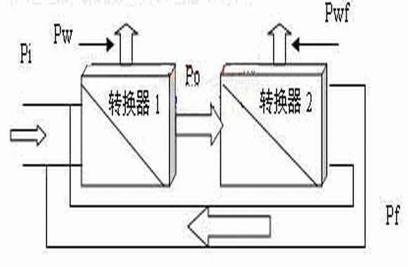 第二種工作模式是引入能量反饋的情況下,能量轉換如圖3所示:轉換器1為需要例行使用的電源轉換器,轉換器2為用于能量反饋的轉換器,Pi為系統外給轉換器1的輸入能量,Pw為轉換器1轉換過程中的消耗能量,Po為例行使用電源轉換器1正常應輸出的能量,同時也是轉換器2的輸入能量;Pwf為用于能量反饋的轉換器2轉換過程中的消耗能量,Pf為轉換器2反饋給電源轉換器1的能量。