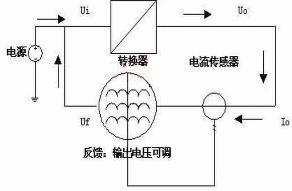 能量反饋部分和需要例行試用的轉換器組成一個能量循環系統,在外電源的激勵下,系統保持額定功率運轉。由功率公式P=U*I,U由例行老化的電源轉換器穩定,要保證該額定功率,就是保證輸出電流I,即能量反饋部分設計成恒流電路,所以系統在額定功率下,保證能量循環穩定工作的等效控制量為需要例行使用的電能轉換器的輸出電流。