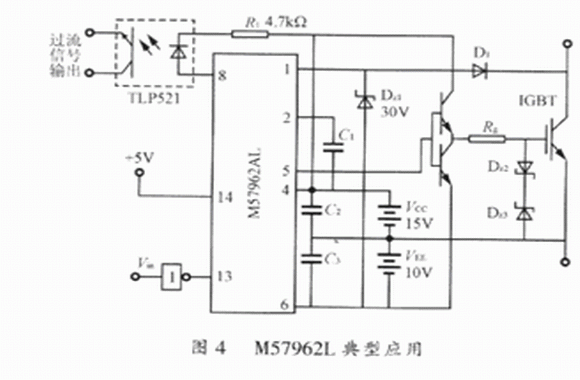 典型應用圖如圖4所示。當驅動信號通過腳14和腳13時,經過高速光耦隔離,由M57962AL內置接口電路傳輸至功率放大極,在M57962AL的腳5產生+15V開柵和一10V關柵電壓,驅動IGBT通斷。當腳1檢測到電壓為7V時,模塊認定電路短路,立即通過光耦輸出關斷信號,使腳5輸出低電平,從而將IGBT的G—E兩端置于負向偏置,可靠關斷。同時,輸出誤差信號使故障輸出端(腳8)為低電平,從而驅動外接的保護電路工作。延時2~3s后,若檢測到腳13為高電平,則M57962AL恢復工作。穩壓管DZ1用于防止D1擊穿而損壞M57962AL,Rg為限流電阻,DZ2和DZ3起限幅作用,以確保可靠通斷。