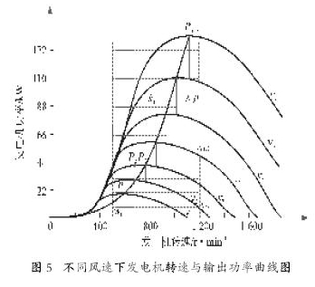 風力機通過葉輪來捕獲流動的風能,風的能量轉(zhuǎn)化為葉輪旋轉(zhuǎn)的動能,齒輪箱再把這種機械能傳輸?shù)桨l(fā)電機,由發(fā)電機通過內(nèi)部的電磁關(guān)系將機械能變?yōu)殡娔茌敵觥D5為在不同風速下,葉輪轉(zhuǎn)速與風力機輸出功率的關(guān)系圖。由圖可知,對應(yīng)于每個風速的曲線,都有一個最大輸出功率點,風速越高,輸出功率越高,相應(yīng)的葉輪轉(zhuǎn)速也越高。因此,如果能隨風速變化改變?nèi)~輪轉(zhuǎn)速,使得風力機在所有風速下都工作于最大功率輸出點,則發(fā)出電能最多,否則發(fā)電效能將降低。