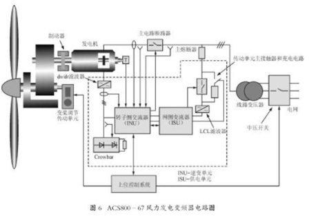ACS800-67 風力發(fā)電變頻器主要和帶有轉(zhuǎn)子繞組和滑環(huán)的感應(yīng)式發(fā)電機一起使用,連接于雙饋發(fā)電機轉(zhuǎn)子和電網(wǎng)之間,電路圖如圖6所示。該變頻器既可以安裝在塔基處也可以安裝于發(fā)電機艙內(nèi)。