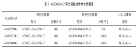 如前所述,雙饋風力發(fā)電系統(tǒng)的變頻器由于接在發(fā)電機的轉(zhuǎn)子側(cè),所以變頻器容量可小于發(fā)電機的容量,僅為發(fā)電機的轉(zhuǎn)差功率,因此,變頻器容量的選擇與風力發(fā)電機的調(diào)速范圍密切相關(guān)。一般風力發(fā)電機的調(diào)速范圍為額定轉(zhuǎn)速的70%~130%,轉(zhuǎn)差率為±30%,所以變頻器的額定容量可選為發(fā)電機額定容量的1/3。表1為ACS800-67的選型表。