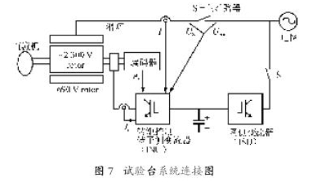 上海南洋電機廠采用ACS800-67 變頻器構(gòu)建雙饋風力發(fā)電機的實驗平臺,風力機采用直流電動機模擬,即雙饋發(fā)電機轉(zhuǎn)子靠直流電動機拖動。系統(tǒng)連接示意圖如圖7所示。技術(shù)數(shù)據(jù)如下:發(fā)電機定子額定電壓690 V,定子額定電流1500A,額定頻率50 Hz,額定功率1 345kW,額定轉(zhuǎn)速1 513 r/min,同步轉(zhuǎn)速1 500 r/min,功率因數(shù)0.9,轉(zhuǎn)子開路電壓1990V,轉(zhuǎn)子電流550A;變頻器型號ACS800-67-0480/0770-7,調(diào)速范圍±30%。