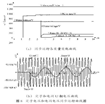 圖8(b)所示為電網(wǎng)U 相電壓與定子U 相電壓在同步過程中的變化曲線。由圖可知,當變頻器投入運行后,定子U 相電壓迅速建立,并與電網(wǎng)U 相電壓在相位、幅值上完全一致,達到同步的要求。