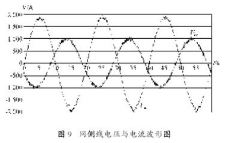 圖9 為發(fā)電機處于超同步運行(轉(zhuǎn)子轉(zhuǎn)速為1 513 r/min),給定轉(zhuǎn)矩為額定轉(zhuǎn)矩的85%,無功功率給定為零時,電網(wǎng)線電壓、相電流的波形圖。理論分析可知,當發(fā)電機處于超同步運行狀態(tài),發(fā)電機的定子側(cè)和轉(zhuǎn)子側(cè)應(yīng)同時向電網(wǎng)輸出電能,網(wǎng)側(cè)相電流為定子與轉(zhuǎn)子的電流之和。通常網(wǎng)側(cè)變流器的無功功率給定設(shè)置為零,所以定子與轉(zhuǎn)子電流的相位相同,都與電網(wǎng)電壓反相。實際上,由圖可知,電網(wǎng)相電壓與定子電流相位相差180°,完全反相,發(fā)電機處于發(fā)電狀態(tài),向電網(wǎng)輸出電能,功率因數(shù)為-1。