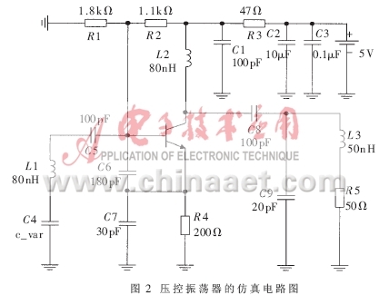 壓控振蕩器(VCO)是鎖相環(huán)路的重要組成部分。隨著電子技術的發(fā)展,出現(xiàn)了許多集成的VCO芯片。考慮到高頻率穩(wěn)定度、低相噪的要求,這里采用Agilent公司生產(chǎn)的低噪聲晶體管HBFP0450來設計VCO。常用的VCO一般有三種:晶體壓控振蕩器、LC壓控振蕩器和RC壓控振蕩器。對于超高頻段的VCO,采用LC振蕩器形式;為了提高頻率穩(wěn)定性,采用了克拉潑電路,并進行了相角補償。