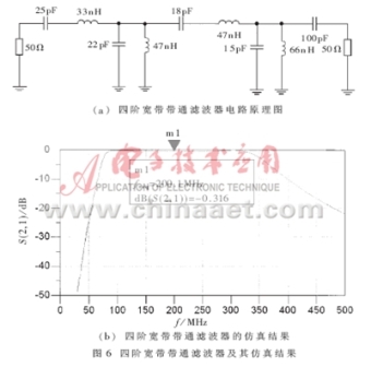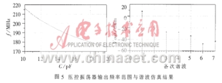 從圖5可以看出,壓控振蕩器的輸出頻率范圍為175MHz~217MHz,基波(頻率為214MHz時)輸出功率為7.911dBm,二次諧波為-16.368dBm,可見有效地抑制了諧波分量。在實際應用中,對諧波濾除的要求比較高,可以在輸出端接入寬帶濾波器,其電路原理圖和仿真結(jié)果見圖6。這樣,可以更有效地濾除高次諧波,同時有利于輸出匹配,減小負載對輸出功率的影響。