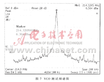 式中,fm為頻偏,KVCO為VCO控制靈敏度,fo為振蕩頻率,Q為品質(zhì)因數(shù),F為晶體管的噪聲系數(shù),K為波爾茲曼常數(shù),T為工作溫度,Ps為振蕩信號功率,fc為閃爍噪聲拐角頻率,Vm為低頻噪聲源的總幅度。從式(5)可以看出,選擇噪聲系數(shù)小的放大管、增加諧振回路有載Q值、減小VCO控制靈敏度、提高輸出信號功率都可以降低相位噪聲。通過減小變?nèi)莨茉谥C振回路中的接入系數(shù),可以有效減小VCO控制靈敏度,但是也會導致頻率覆蓋范圍的減小,所以要適當選擇接入系數(shù)。該VCO輸出頻率為200MHz時,變?nèi)莨芙尤胂禂?shù)為0.63。通過適當調(diào)整輸出回路的電感和分壓電容,可以提高負載阻抗,從而有效地提高輸出功率,以達到降低相位噪聲的目的。通過軟件仿真,在頻偏10kHz處的輸出相位噪聲為-101.3dBc/Hz,在100kHz處的相位噪聲為-122.5dBc/Hz。