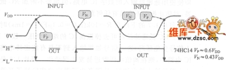通常CMOS數字IC的閾值電壓(區別L和H的電壓電平)VT,只是一點,圖1表示具有施密特觸發電路的反相電路、74HC14的閾值電壓。施密特觸發電路具有高電平閾值Vp和低電平閾值Vn,閾值間具有磁滯電壓VH,VH為Vp-VN。即VP以下的輸人電平可被確定邏輯輸出;磁滯電壓VH,以下時,即使有噪聲,輸出電平也不變化。因此,具有施密特輸人的數字IC電路,即使加上變化緩慢的信號,因噪聲等引起輸出電平翻轉的危險也會變少。在數字電路的輸人電路中插入RC低通濾波器,可去掉輸人信號中含有的噪聲,整形輸出波形。