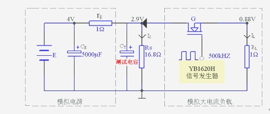 由E、CE、rE組成模擬電源,電源電壓E=4 V,電源內阻rE=1Ω;CT為去耦(測試)電容;