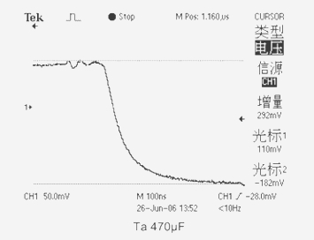 2、當測試電容為(Ta)鉭電解電容器CT=470μF ESR=149mΩ時,輸出電壓下跌值為292mV。