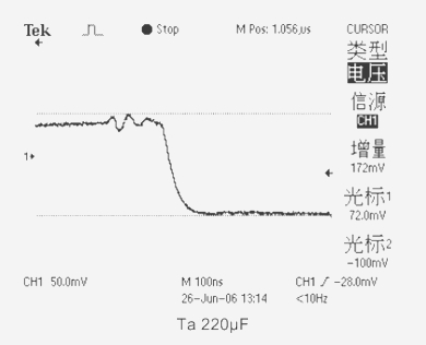 2、Ta固體片式鉭電解電容器,其中470μF雖然容量較大,ESR值卻較高(149 mΩ)而效果還不如220μF(73mΩ)的好。因此,由于ESR值較高,電容的陰極材料MnO2的電導率較低(0.1S/cm),其高頻特性不好而使得應用效果不理想,電源電壓變化值達到了292mV和172mV。