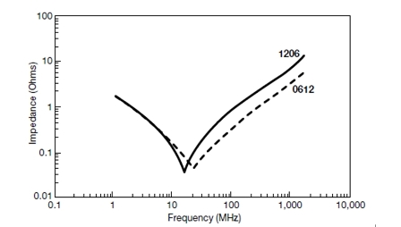 對于各類表面貼裝的不同封裝的電感值,可以利用方程2中所描述的測量技術(shù)來計算。例如,如果系統(tǒng)中產(chǎn)生了800MHz的噪聲,隨后可以在PCB上將其定位到一個確定的區(qū)域。選擇一個標(biāo)稱容量為39pF的電容,并將其安裝到盡可能靠近產(chǎn)生噪聲的地方,這對于減小EMI來說,將是最好的選擇。減小矩形芯片電感的一個有效方式就是改進(jìn)芯片縱長方向端頭的設(shè)計。所選電容器的阻抗曲線如圖4所示。注意通過改變縱橫比,寄生電感減小了大約50%,即從1200pH減小到600pH。這有效地偏移開了最大衰減點(diǎn),故在利用這些器件來進(jìn)行EMI濾波時只需牢記這一點(diǎn)。