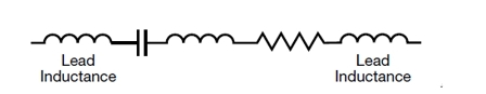 引腳電容相對于表面貼裝電容器,除了增加了引腳之外,其他并沒有什么不同。其等效模型與MLCC模型一樣,除了增加了引腳所產(chǎn)生的電感之外,見圖5。