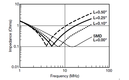 引腳所產(chǎn)生的電感對阻抗的影響如圖6所示。一個很好的經(jīng)驗(yàn)算法是,電路板上每0.10"的引腳長度將產(chǎn)生2.5nH的電感。就像低電感電容器將頻率向高處偏移一樣,引腳器件將頻率往低端偏移。要實(shí)現(xiàn)最佳的EMI濾波,必須牢記這一點(diǎn)。