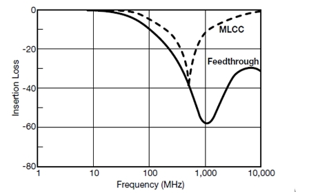 對于寄生參數(shù)來說,這種幾何結(jié)構(gòu)具有幾個有趣的問題。首先,電容器的寄生電感要比具有等效電容的相當(dāng)尺寸的片式電容器要小得多。可以測量穿心電容的寄生電感,大約為250pH。該相同的現(xiàn)象是在降低了電感的同時也降低了ESR(通道長度,通道長度,通道長度!)最后,穿通部分中電感的引入將增加衰減帶寬。圖8給出了一只100pF的穿心電容和一個等效的標(biāo)準(zhǔn)片式電容之間的插入損耗比較。