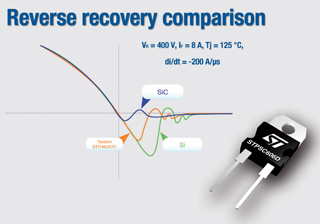 像STPSC806D和STPS1006D 這類碳化硅二極管給開關式電源(SMPS)設計人員帶來的另一個好處是,可以提高開關頻率,使其它元器件如濾波電容和電感變得更小,成本更低廉,功耗更低。