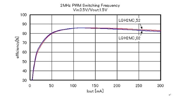 圖3展示了降壓型DC-DC轉換器使用時,使用LQH2MCN2R2M02及LQH2MCN2R2M52時的電源電壓變換效率的評價結果。LQH2MC_52系列雖最大厚度只有0.7mm的小型化產品,但卻和最大0.95mm厚的LQH2MC_02系列一樣,達到了很高的電源電壓變換效率。