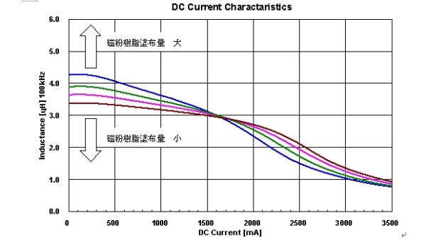LQH55P_R0系列在卷線周圍全部涂有磁性樹脂,從而提高磁屏蔽,這樣做能夠獲得更低的直流電阻值。另外,由精密的涂層技術控制磁性樹脂的涂量,從而調節實際有效的μ并控制所需要的感值和直流偏置特性。圖5中表示了磁性樹脂涂量變化時的直流偏置特性。精密磁性樹脂涂層技術使較大電流時可維持最低限度的感值,以及減少初期感值低下等直流偏置特性可以得到自由控制。