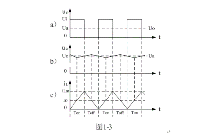 圖1-3、圖1-4、圖1-5分別是控制開(kāi)關(guān)K的占空比D等于0.5、< 0.5、> 0.5時(shí),圖1-2電路中幾個(gè)關(guān)鍵點(diǎn)的電壓和電流波形。圖1-3-a)、圖1-4-a)、圖1-5-a)分別為控制開(kāi)關(guān)K輸出電壓uo的波形;圖1-3-b)、圖1-4-b)、圖1-5-b)分別為儲(chǔ)能濾波電容兩端電壓uc的波形;圖1-3-c)、圖1-4-c)、圖1-5-c)分別為流過(guò)儲(chǔ)能電感L電流iL的波形。