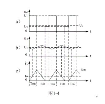 (3)當(dāng)Ui < 2Uo時(shí),即:濾波輸出電壓Uo大于電源輸入電壓Ui的一半時(shí),或控制開(kāi)關(guān)K的占空比大于二分之一時(shí):在K接通期間,雖然流過(guò)儲(chǔ)能電感L的電流上升率(絕對(duì)值),小于,在K關(guān)斷期間,流過(guò)儲(chǔ)能電感L的電流上升率(絕對(duì)值)。但由于Ton大于Toff,(1-5)式中i(0)和(1-11)式中iLX均大于0,即:電感存儲(chǔ)能量每次均釋放不完。在這種情況下,流過(guò)儲(chǔ)能電感L的電流iL是連續(xù)電流,開(kāi)關(guān)電源工作于連續(xù)電流狀態(tài),輸出電壓Uo的紋波比較小,且濾波輸出電壓Uo大于濾波輸入電壓uo的平均值Ua。參看圖1-5。