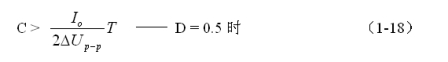 同理,(1-17)和(1-18)式的計算結(jié)果,只給出了計算串聯(lián)式開關(guān)電源儲能濾波電容C的中間值,或平均值,對于極端情況可以在平均值的計算結(jié)果上再乘以一個大于1的系數(shù)。