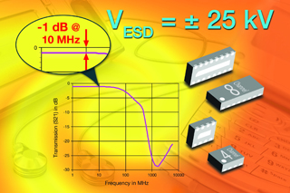 新款VEMI濾波器陣列的厚度只有0.6mm,可節省電路板空間,并為便攜式游戲機、PDA、智能手機和其他接收800MHz~2400MHz頻段RF信號的系統中的嵌入式攝像頭和LCD提供EMI濾波和ESD保護功能。VEMI陣列中的低通濾波器使低頻信號在通過時的衰減非常低,而將移動通信系統的載波頻率這樣的高頻信號短路到地。