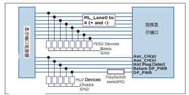 圖11是一種典型的顯示端口保護電路。2.7GHz的高頻信號線采用8個PESD保護元件,輔助通道工作頻率為1MHz,采用5個MLV保護元件;在低壓直流電源中則采用了PolySwitchTM元件作過流保護。這樣的設計既滿足電路能耗要求,并且降低了成本。