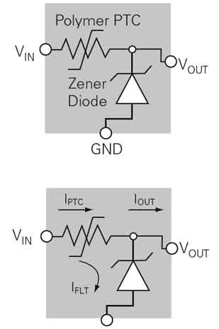 在正常工作時,VIN輸入電壓高于齊納二極管的擊穿電壓VZ,有IFLT電流經齊納二極管到地,VOUT輸出穩(wěn)定的電壓。有不正常的過壓輸入 VIN時,則齊納二極管的IFLT會產生過流,當器件上有過流時,其電阻由低阻態(tài)瞬變到高阻態(tài),使在其上的壓降大增,VOUT輸出基本不變,而流過齊納二極管的電流IFLT反而減小,如圖16所示。器件上電壓降的增大既保護了齊納二極管,又保護了下游的電路。另外,若被保護的下游電路中存在有局部短路或短路故障時,IOUT會增加,PPTC元件由低阻態(tài)變成高阻態(tài),可使電路得到過流保護。