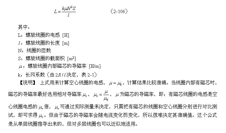 在這種情況下,最好的方法是先制作一個簡單樣品,例如,在某個選好的變壓器鐵芯的骨架上繞一個簡單線圈(比如匝數為10),然后對線圈的電感量進行測試,或者找一個已知線圈匝數與電感量的樣品作為參考。知道了線圈樣品的電感量后,只需把已知參數代入(2-108)或(2-94)式,即可求出其它未知參數,然后把所有已知參數定義為一個常數k;最后電感的計算公司就可以簡化為:L = kN2 ,這樣,電感量的計算就變得非常簡單。
