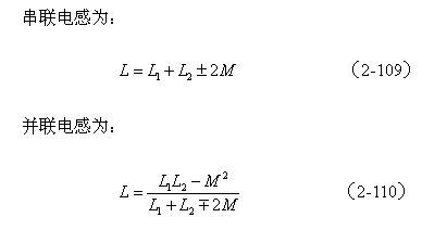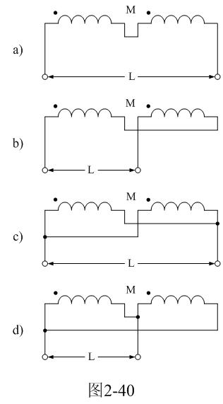 【說明】互感M有正負,圖2-40-a和圖2-40-c的接法互感M為正,圖2-40-b和圖2-40-d的接法互感M為負。兩個線圈之間的互感M為: