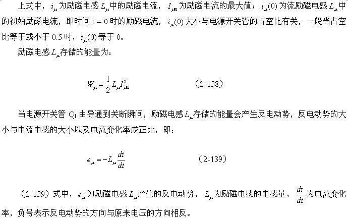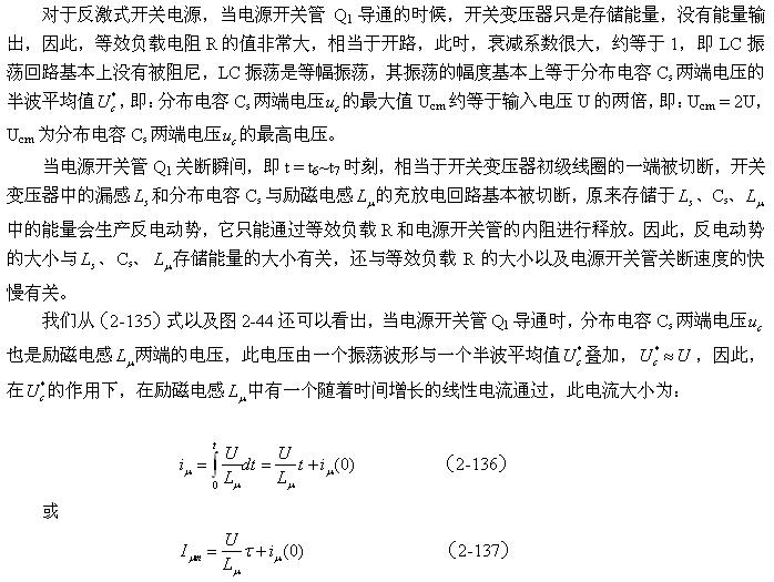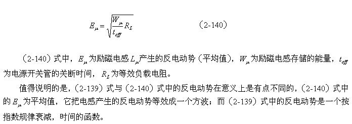 (2-140)式對于計算漏感 產生的反電動勢或其它電感產生的反電動勢同樣有效。漏感 中存儲的能量可根據(2-138)式求得;而流過漏感 的電流,對于反激式開關電源:可認為與勵磁電流的大小基本相等,因為,在反激式開關電源中,等效負載電阻等于無限大;對于正激式開關電源:可認為與流過等效負載電阻的電流大小基本相等,因為,在正激式開關電源中,勵磁電流相對于流過等效負載電阻的電流,很小。
