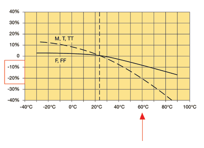 與大多數電子元件一樣,熔絲也會隨溫度的變化而降低額定值。例如,原本在室溫下只需使用1A大小延時熔絲的電路,在60℃下必須使用1.25A大小的熔絲,以保證電路能夠在較高溫度下正常工作(如圖1所示)。