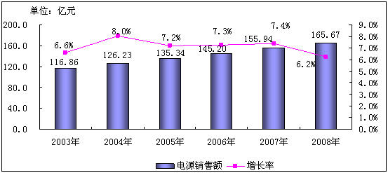 - 2008年中國電源市場銷售額165.67億元,同比增長6.2%