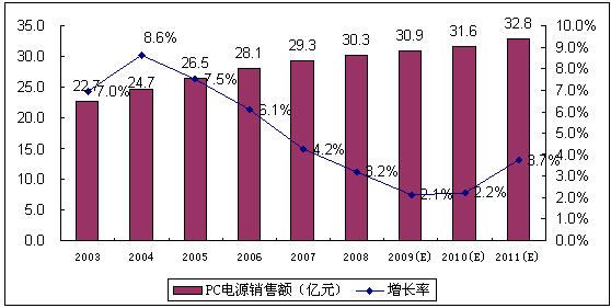 - 2009年中國PC電源市場的增長率將進一步下降,銷售規模同比增長3.8%,銷售額同比增長2.1%