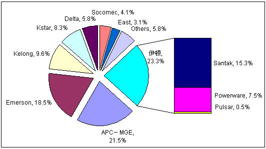 2006年以來,中國UPS市場開始了廠商之間一系列的并購整合,競爭格局開始重新洗牌,直到2008年,新的格局才基本確立。目前,市場第一陣營被國際三巨頭伊頓、施耐德、艾默生占據,市場份額達到63.3%。而科華、科士達這兩個國內自主品牌廠商也憑借良好的發展狀態和合理的市場策略脫穎而出,躋身UPS市場的第二陣營。
