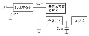 對于這種架構,有時負載開關會連接到降壓變換器輸出(圖2),然后射頻模塊連接到負載開關,這樣降壓變換器就只能用較小的輸入電容。這將導致輸入電壓紋波大,尤其是其輸出瞬態過載時,輸入電壓的最低點可能低于其最小工作電壓Vcc(Min),系統將關斷而復位重新起動,因此也不建議采用這種方式。
