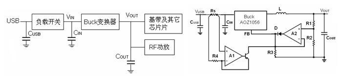圖1b所示電路需要用二個運放,A1用于檢測輸入電流,A2用于隔離電壓和電壓反饋信號,以保證電壓和電壓反饋信號中只有其中的一個信號參與系統的反饋工作。二極管D防止運放A2的輸出管腳出現灌入電流。請注意,在輸出瞬態過載時,降壓變換器工作于恒流及限流模式,但仍輸出電流。在輸出瞬態過載期間,降壓變換器仍可以提供一定比例的輸出電流給射頻模塊,因此所需的輸出超級電容值可以減小。若限流值為0.5A,則輸出超級電容值可以減小25%。