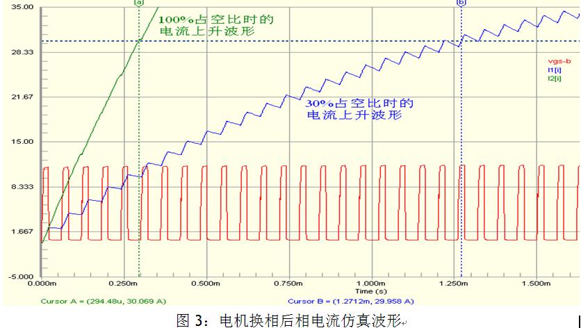 由于在低速大負載運行時,電機的旋轉反電勢很小,為了使電機的相電流不超過允許的最大值,PWM占空比通常比較小,這使得換相后新的相繞組電流上升緩慢。圖3中是電機換相時的電流仿真波形。電機兩相之間的電感為Lm=0.4mH,內阻Rm=0.28歐姆(實際電機的參數)。采用AOS(萬代半導體)生產的AOT460 MOSFET進行仿真。MOSFET的PSPICE模型采用level3等級。由圖3中可以看出,如果PWM占空比為30%,則電流由零上升到30A需要約1.3ms。這與圖2a中實測的波形相仿。為了使換相后電流迅速上升,我們可以使換相后PWM占空比為100%來對電流進行補償,直到電流上升到換相前的電流值,這樣可以使換相電流的波動盡可能的小,時間盡可能地短。由仿真波形中I2可以看出,電流上升到30A的時間小于300us。