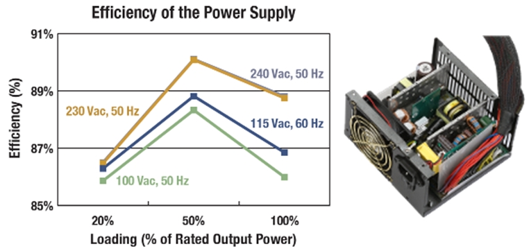 以多路輸出臺式機ATX電源為例,80 PLUS銀級規范、計算產業氣候拯救行動(CSCI)銀級規范自2009年7月開始生效,要求多路輸出臺式機ATX電源在額定輸出功率的20%、50%和100%等條件下能效分別達到85%、88%及85%。后續的80 PLUS金級和CSCI金級規范將于2010年7月開始生效,進一步將能效要求提高到87%、90%和87%。