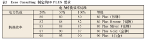 美國能源之星對電源有載、空載工作模式下的工作效率和EcosConsulting制定的80Plus有關工作效率要求分別如表1、表2和表3所示。