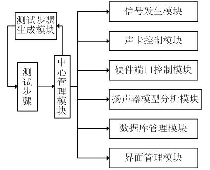 系統軟件采用模塊化設計方法,整個系統包含中心管理模塊、測試步驟生成模塊、聲卡控制模塊、信號發生模塊、揚聲器模型分析模塊、硬件端口控制模塊、數據庫管理模塊和界面管理模塊等等。其中中心管理模塊為核心部分,軟件運行時從該模塊進入,其它功能模塊均在該模塊的管理下,協調一致的工作。各功能模塊均有標準的數據接口,統一經過中心控制模塊完成數據交換,彼此之間不獨自發生聯系,因此可以保證模塊的獨立性,為程序的維護和升級建立了良好基礎。各個模塊完成的功能如下所述: