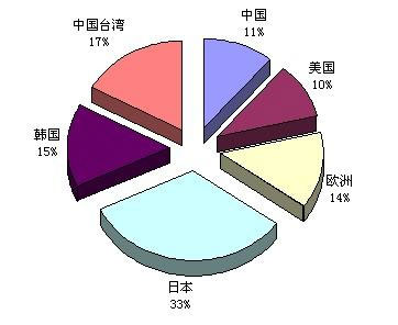 如果以地區別來觀察,日本全球的產值仍居冠,臺灣廠商以市占率17%排名第二。而韓國的市占率由2008年的9%竄升到2009年的15%,位居全球第3。